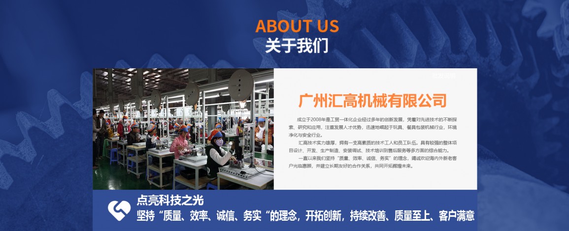 廣州匯高機械設(shè)備有限公司,成立于2008年是工貿(mào)一體化企業(yè)經(jīng)過多年的創(chuàng)新發(fā)展,憑著對先進技術(shù)的不斷探索、研究和應(yīng)用,注重發(fā)展人才優(yōu)勢,迅速地崛起于玩具、餐具包裝機械行業(yè),環(huán)境凈化與安全行業(yè)。